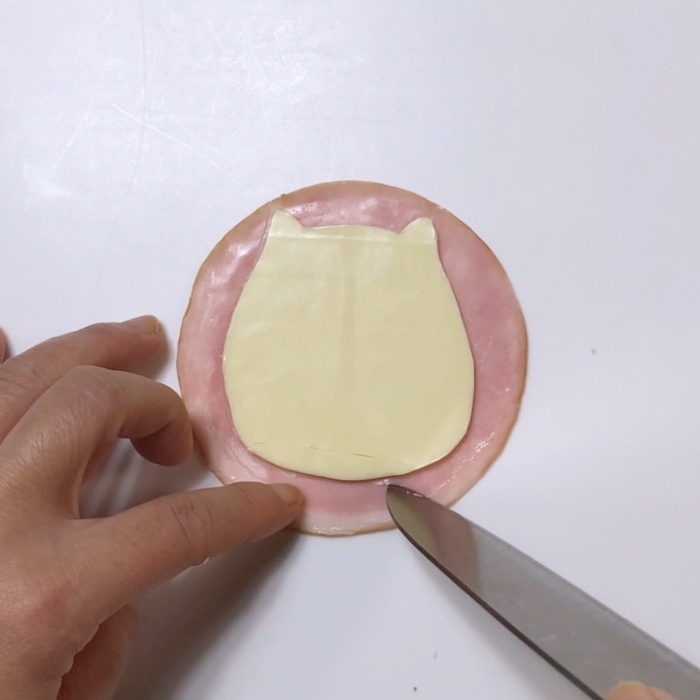 3.2をハムの上に貼り、ナイフでチーズに合わせてハムをカットします。