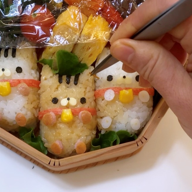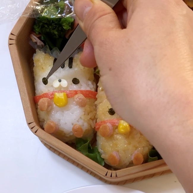 7.海苔を3枚重ね頭の柄の部分をハサミでカットし貼り付ける。
