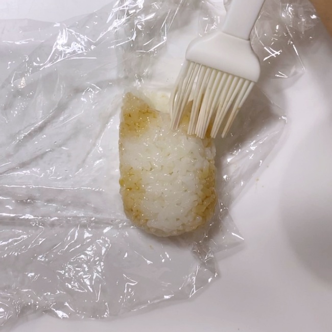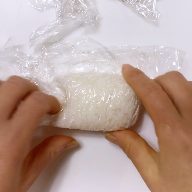 1.ご飯をラップに包んで形成する。