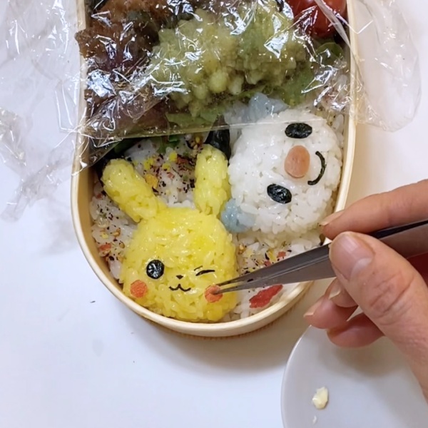 4.お弁当箱に詰めたごはんの上に顔、耳を並べる。