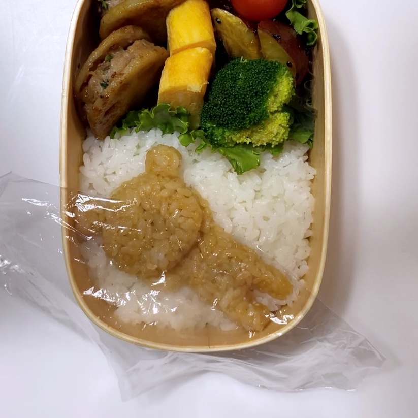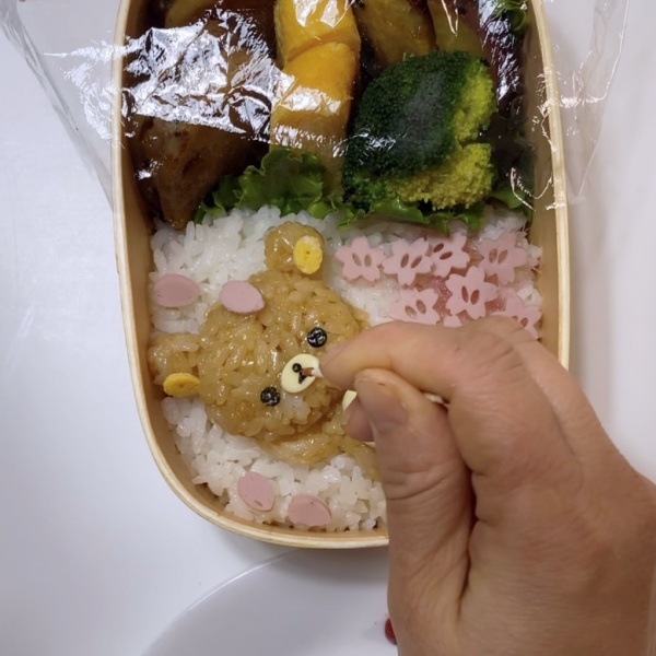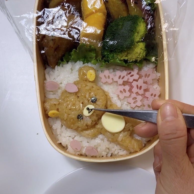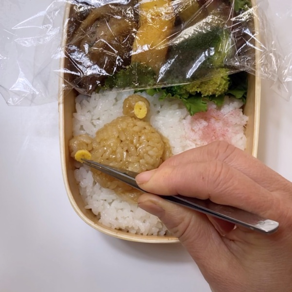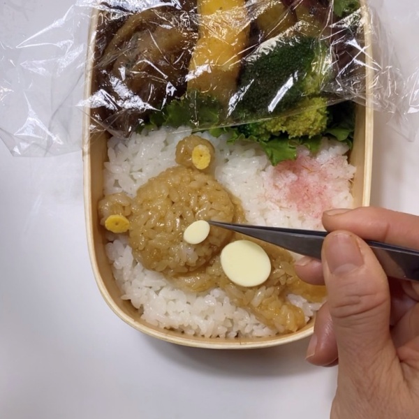 1.ごはんにうなぎのたれを混ぜラップに包み、顔、体、手×2をにぎる。