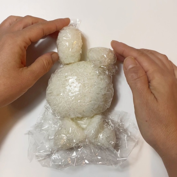 1.ごはんをラップに包み、顔、体、手×2をにぎる。