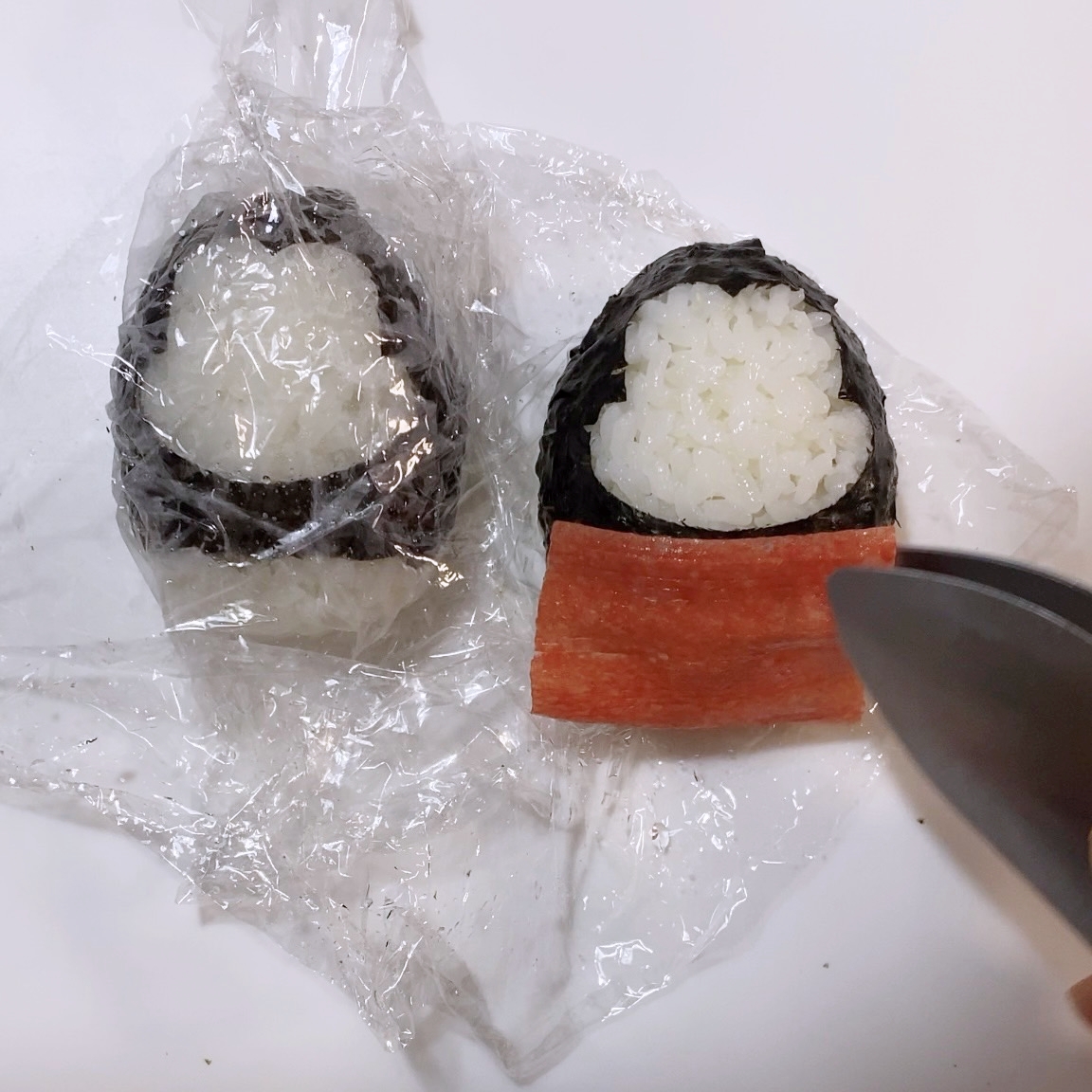 4.カニカマの赤い表面部分をそっと剥がし、体の下部分に巻き付けラップに包んで馴染ませる。