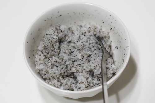 1.お腹の分に少量残し、ごはんにすりごま、塩を入れ色が均一になるまで混ぜ合わせ味を整える。