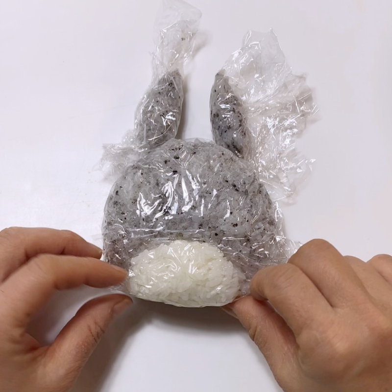 7.残りの顔パーツ、お腹の模様はのりで、ひげはおやつ昆布で作る。