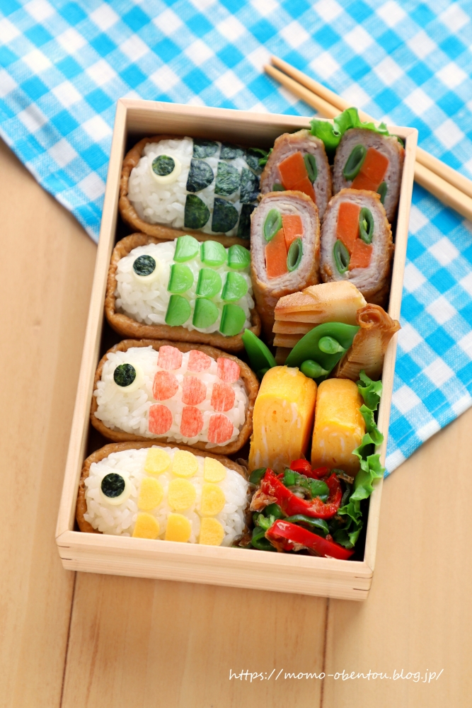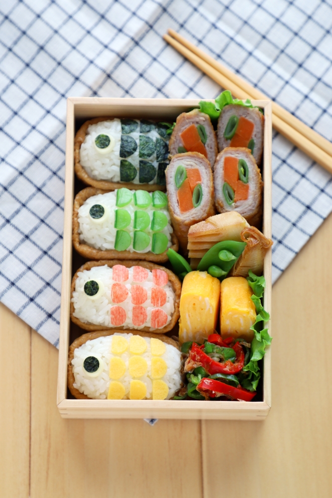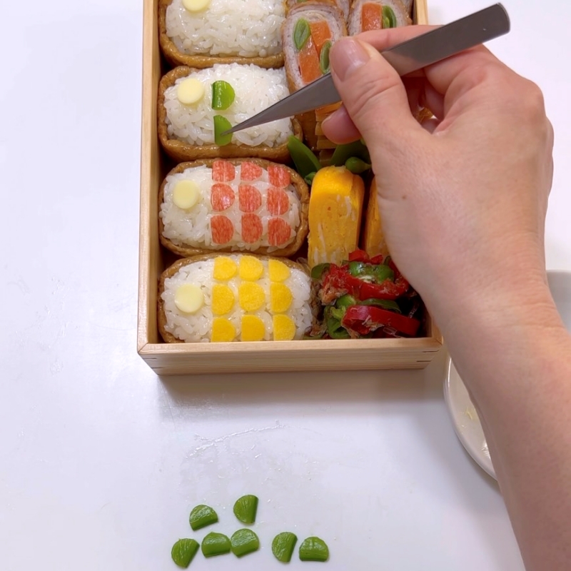 3.うろこの模様は薄焼き卵、カニカマの表面の赤い部分、スナップエンドウを