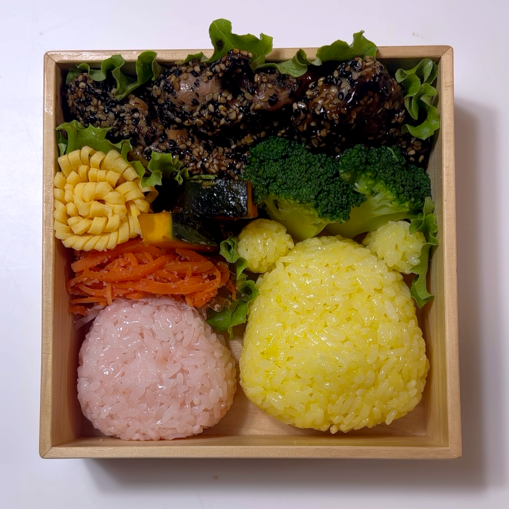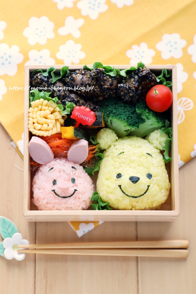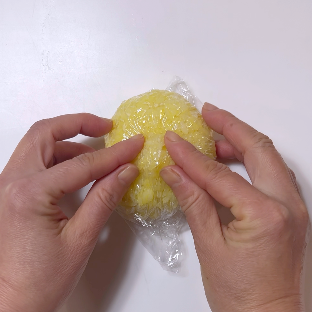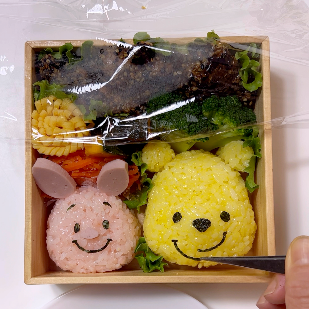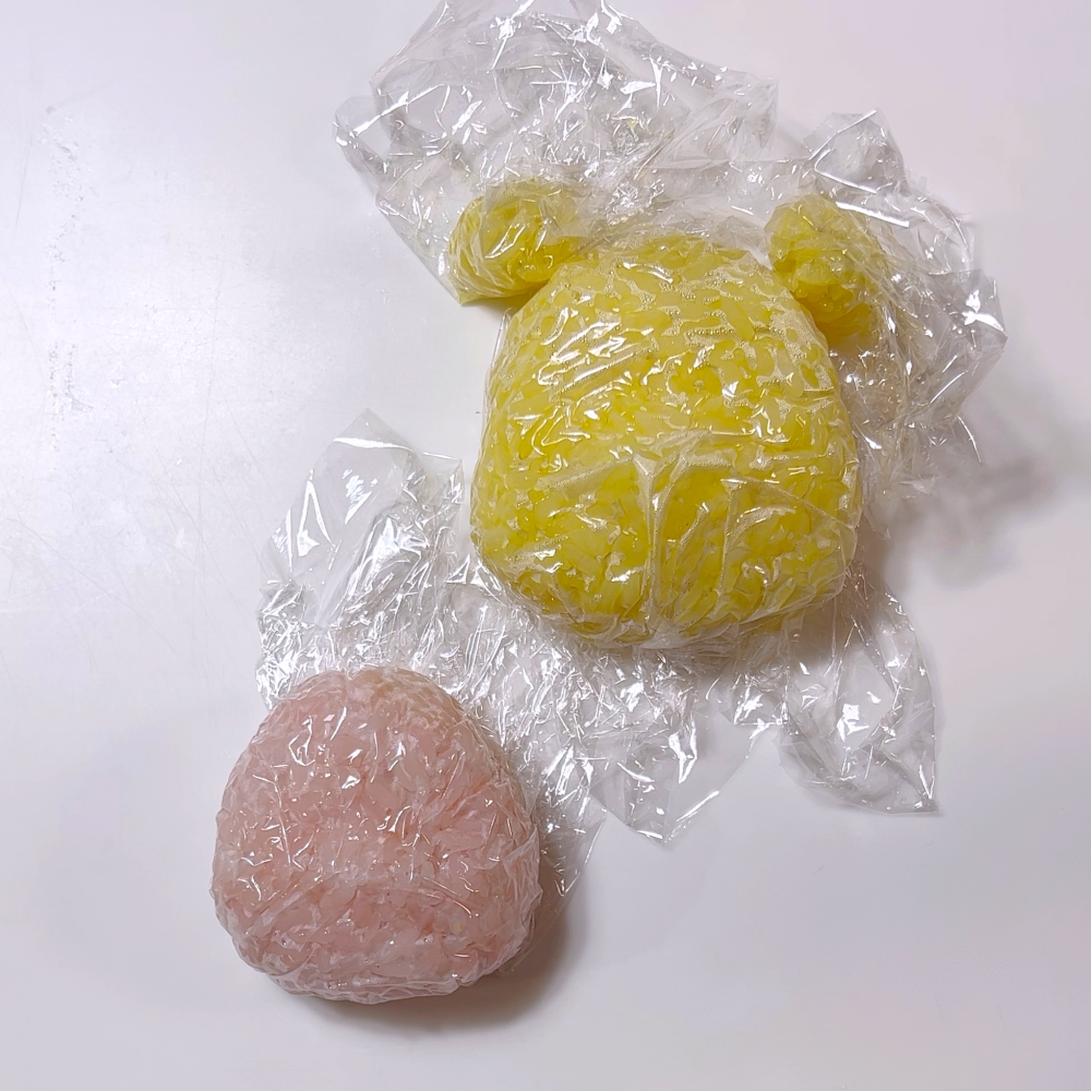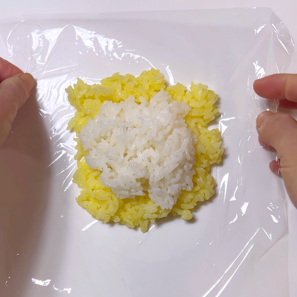 プーさんは表面だけ黄色のごはんにしたので、白いごはんと組み合わせて握っています。