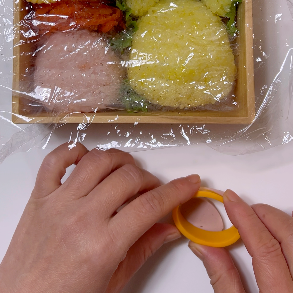 2.ごはんが冷めたらお弁当箱の中で顔と耳を組み合わせて