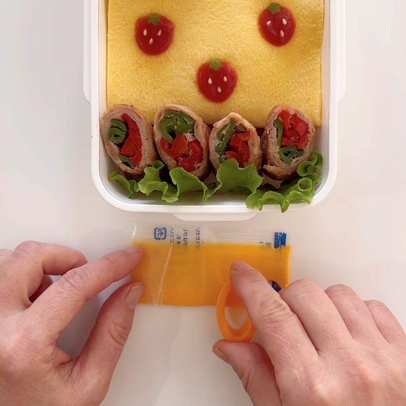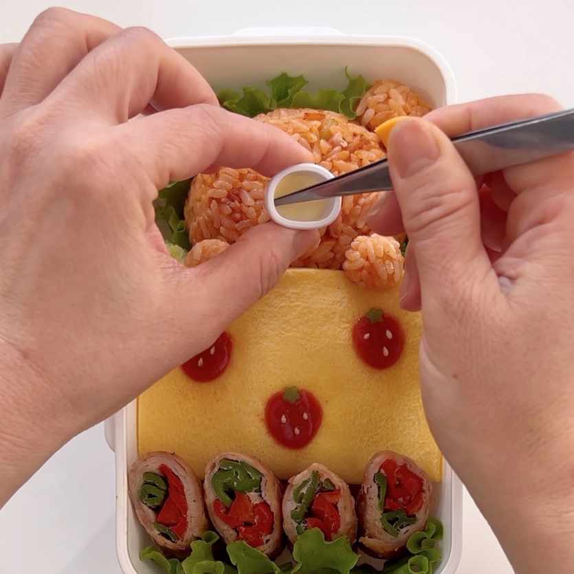 3.薄焼き卵を2つ折りにして体の上のかける。