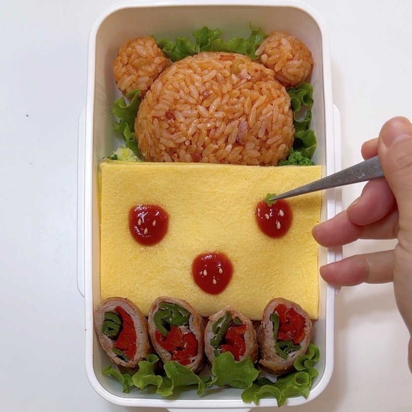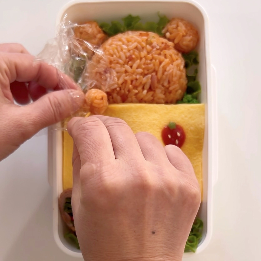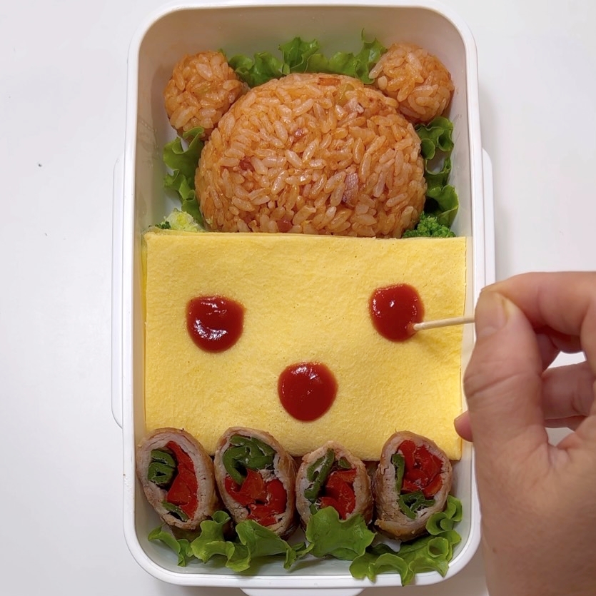 1.ケチャップライスをラップに包み、顔、耳×2、身体、手×2をそれぞれにぎる。