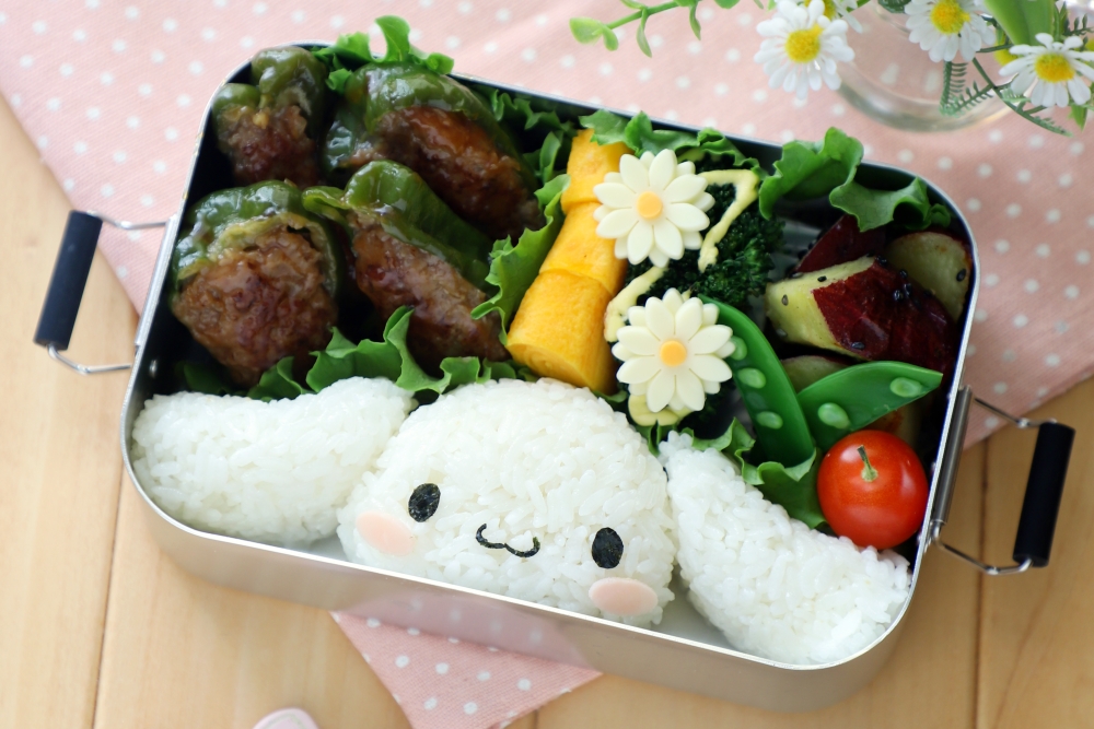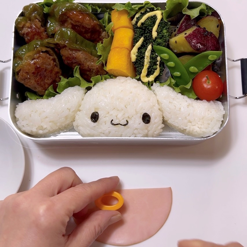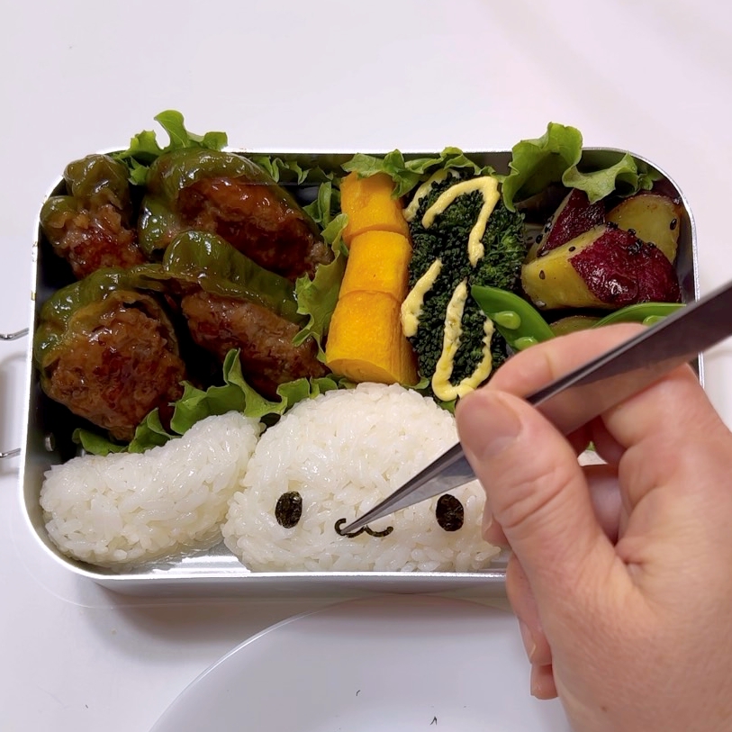2.お弁当箱に詰める。海苔で顔パーツを作る。