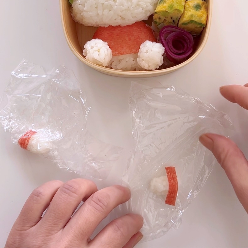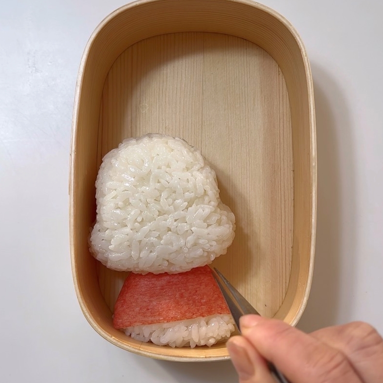 2.弁当箱に顔、体を詰めカニカマの赤い部分を体に巻き付ける。