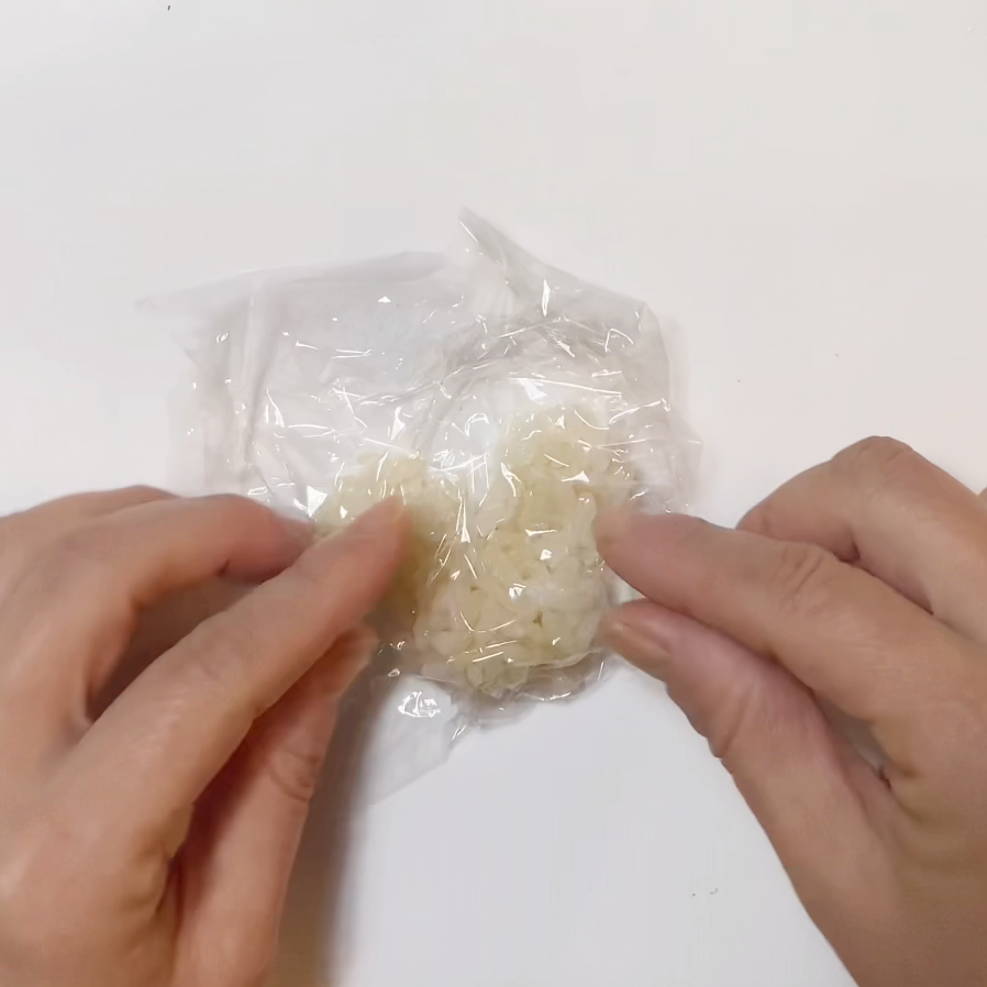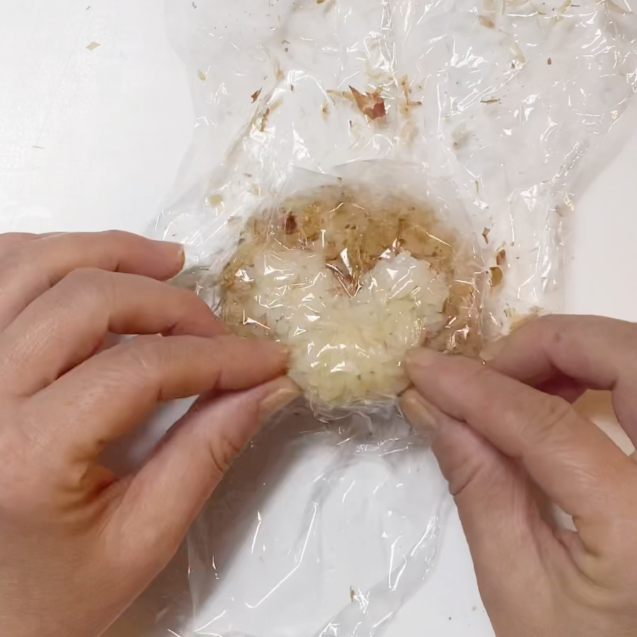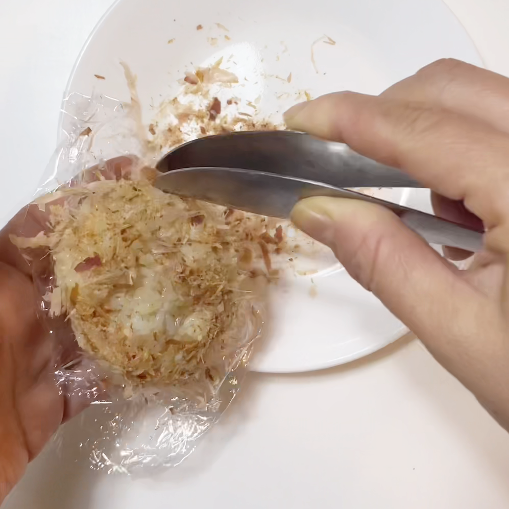 2.1に鰹節をまぶし、ラップで包んで落ち着かせる。