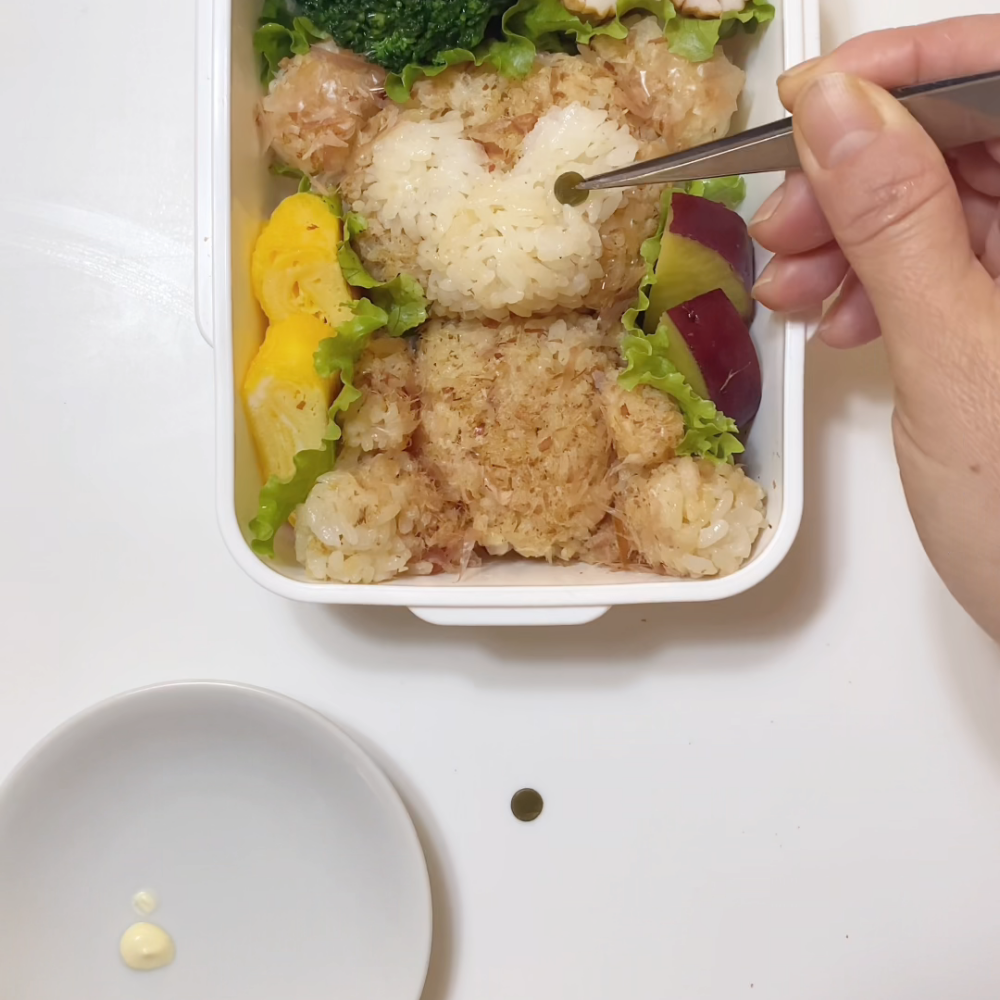3.ごはんにめんつゆを混ぜ顔の薄い色の部分を作ります。