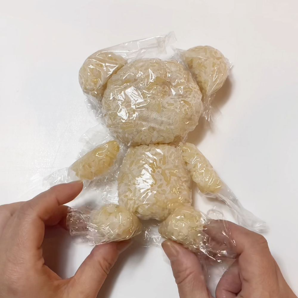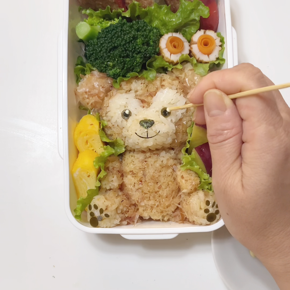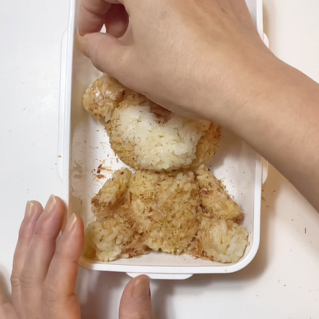 5.お弁当箱に顔と体を詰め耳、手、足はパスタを差してとめる。