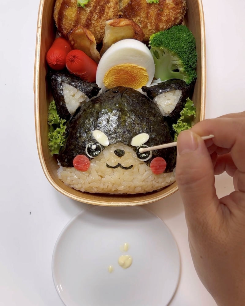8.マヨネーズを爪楊枝で目に付ける。