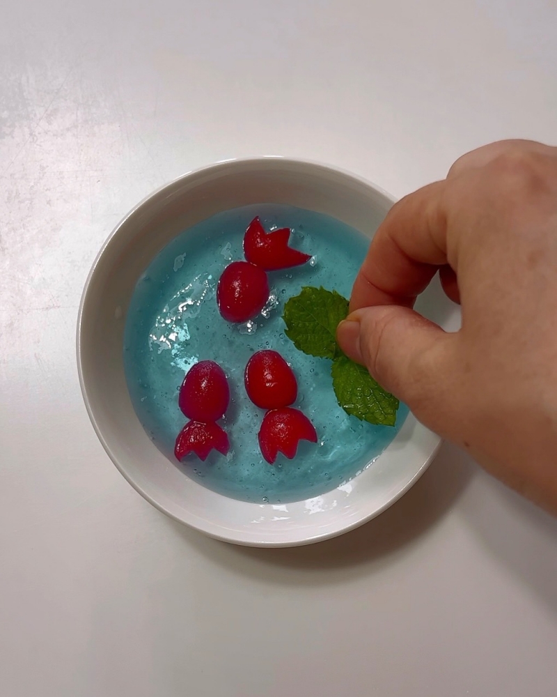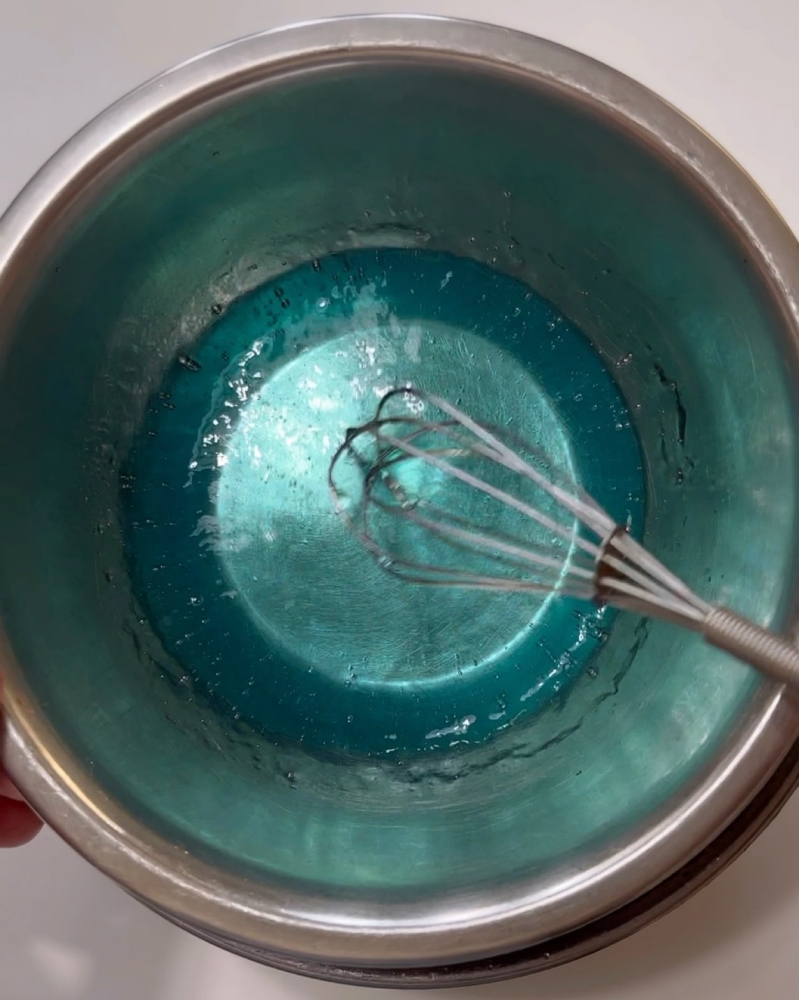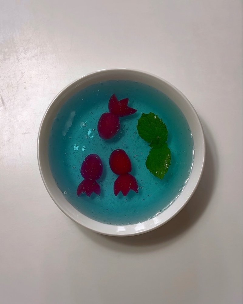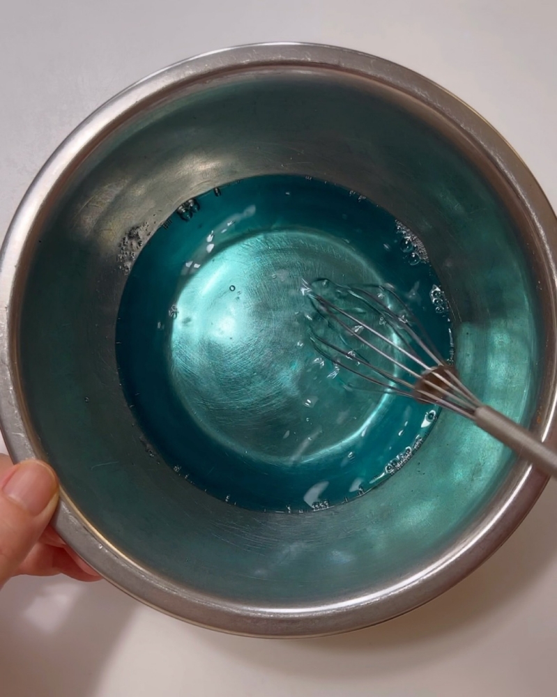 ゼラチンにお湯を加えて良く溶かし、砂糖、水、ブルーハワイシロップを