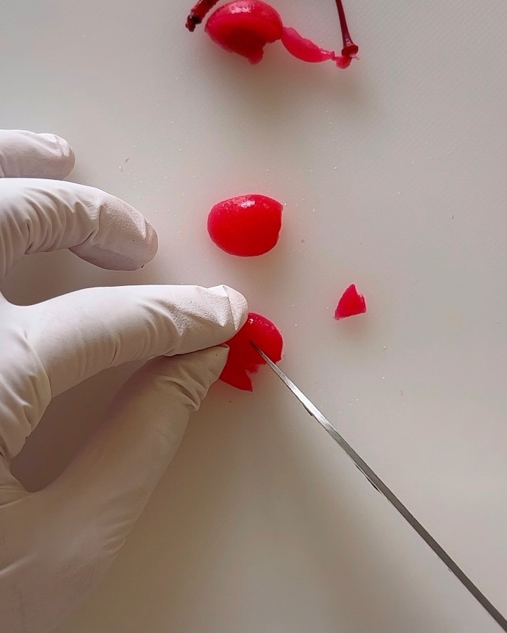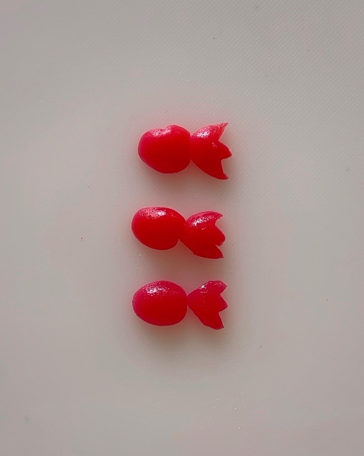 1.チェリーは半分弱に切って金魚の体、残りは種を外して