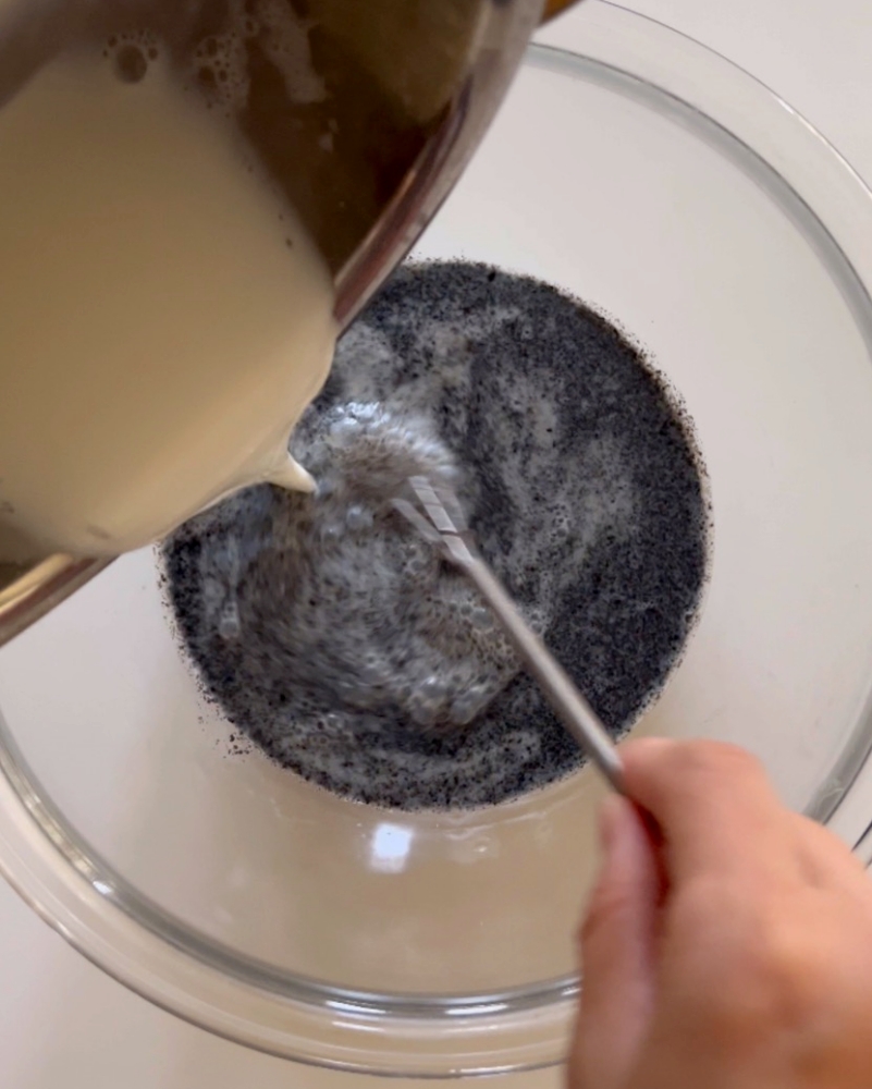 2.ボウルに黒ごまを入れ、1を少量ずつ加えてよく混ぜる。