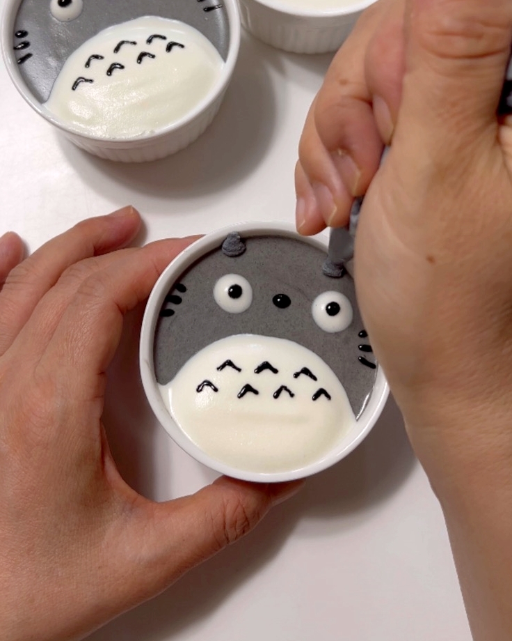 7.ねりごまを絞り袋に入れ、目、鼻、ひげ、お腹の模様を描く。