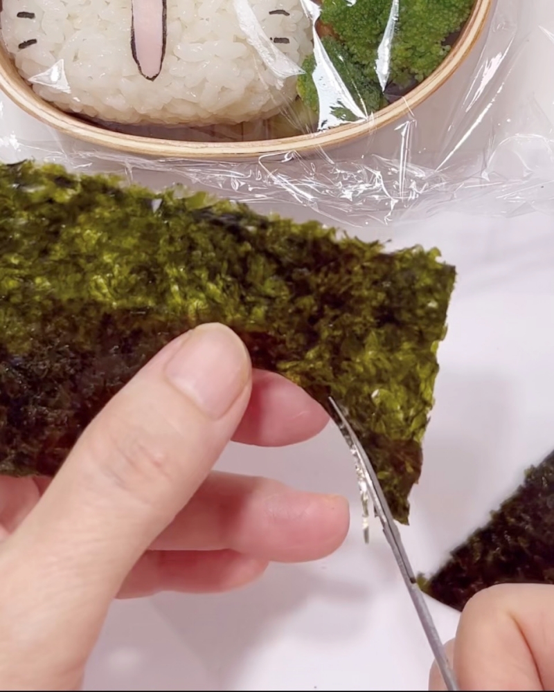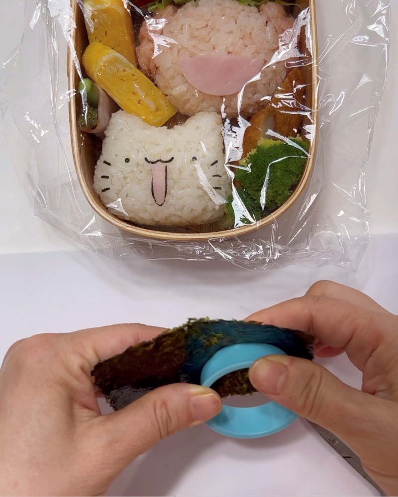 口の周りの海苔は型抜きに使った型で印を付けてその線の上をカット、