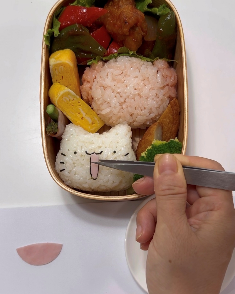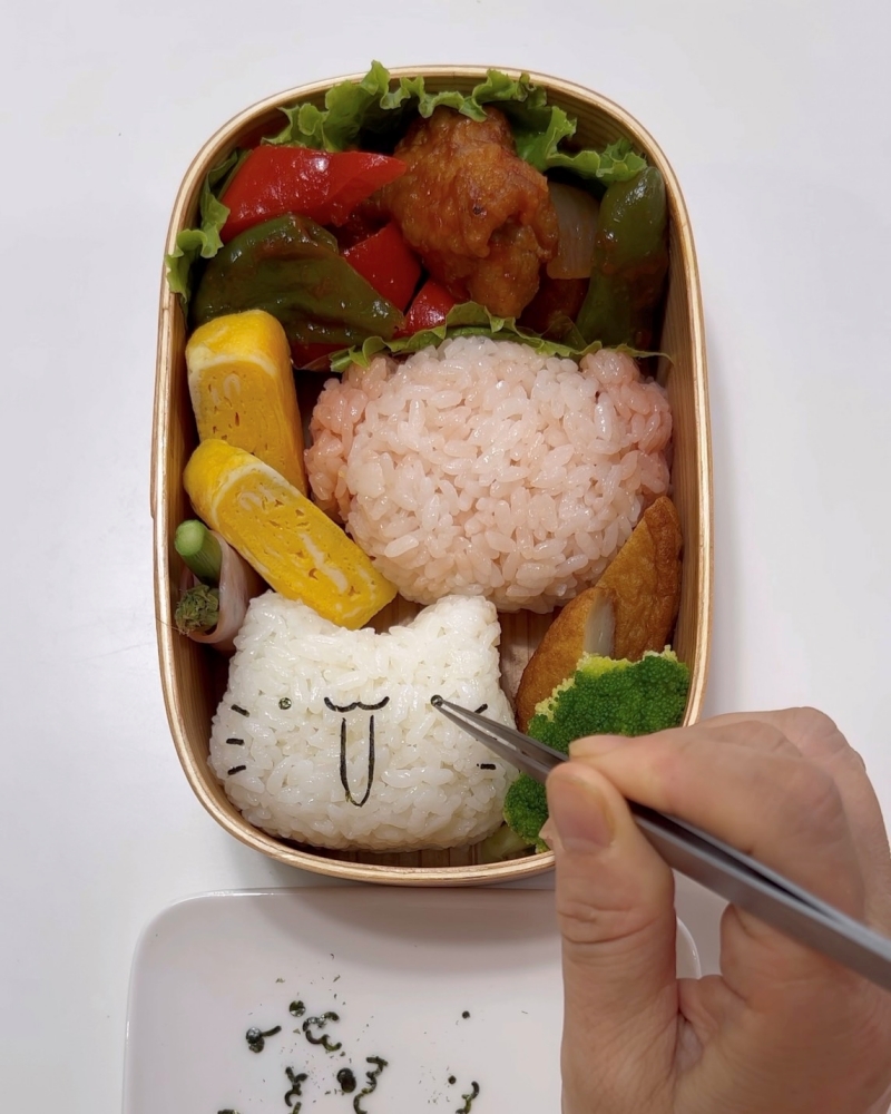 4.お弁当箱に詰め、海苔で顔パーツを作り貼り付ける。