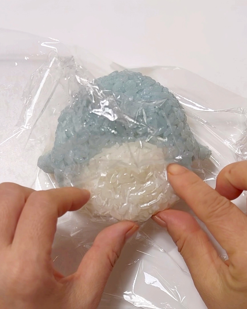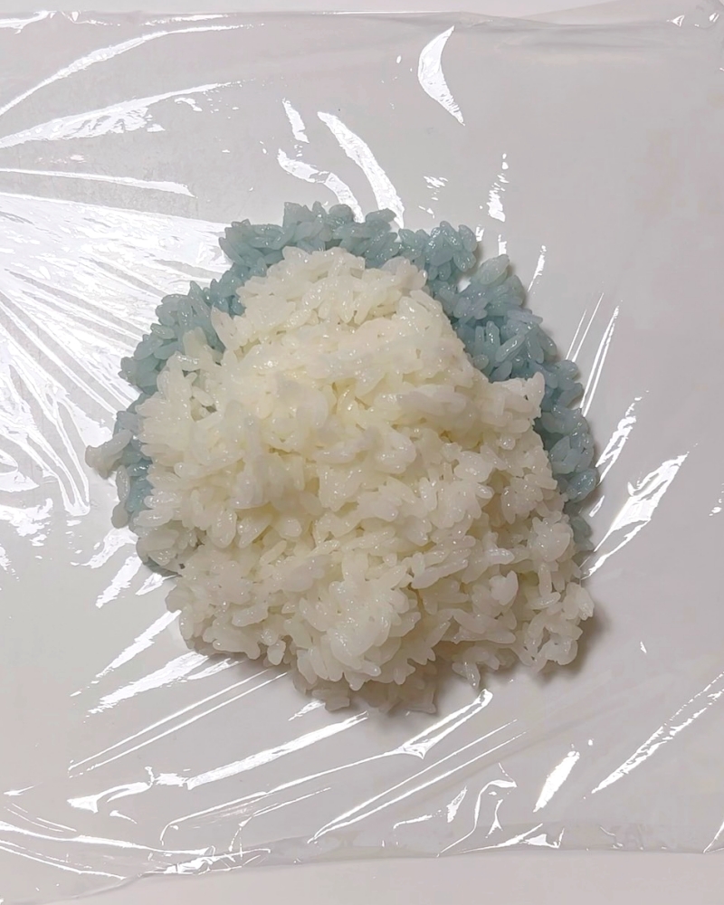 2.その上に白いごはんを乗せ(お腹の部分用に少量残す)握る。