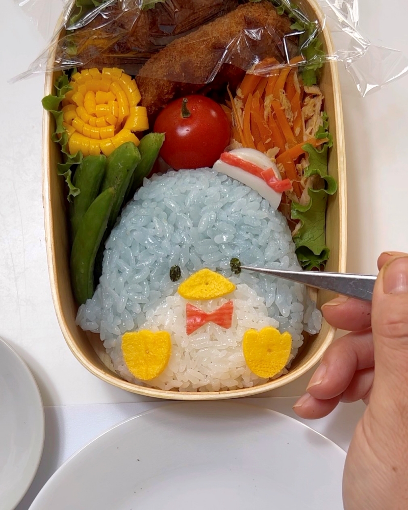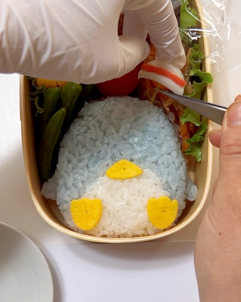 6.カニカマで蝶ネクタイを作りマヨネーズを付けて貼り付ける。