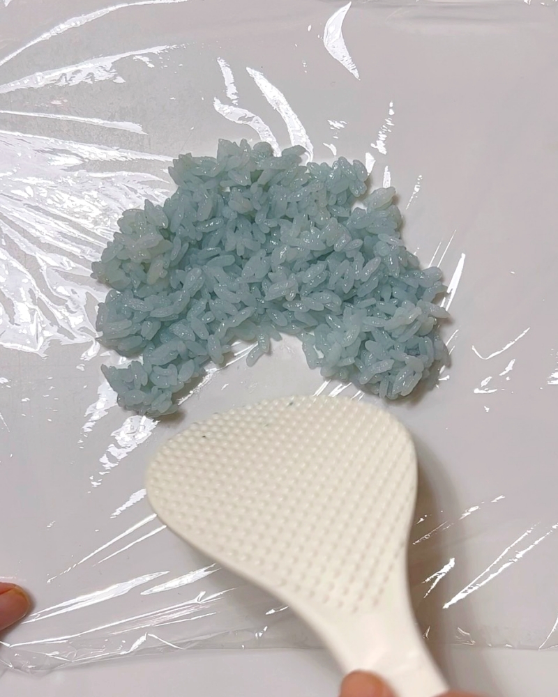1.少量のごはんにデコふりを混ぜ、ラップの上に広げる。