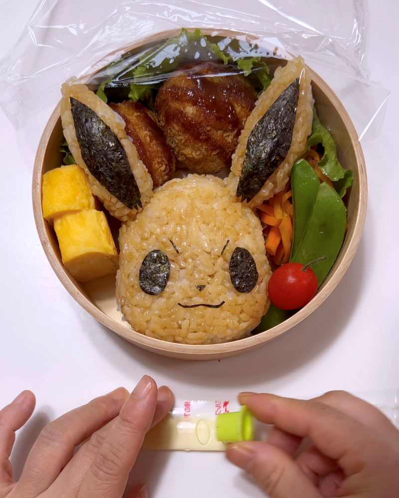 今回はお弁当箱が深いので、おかずの上に耳が乗るように作っています。