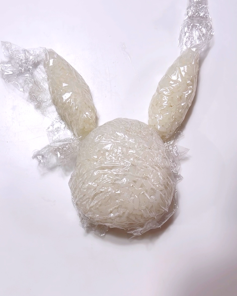 1.ごはんをラップに包み顔、耳を握る。