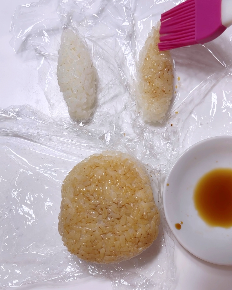 2.ごはんの表面に醤油をハケで塗る。