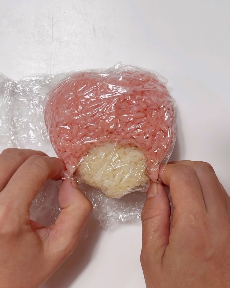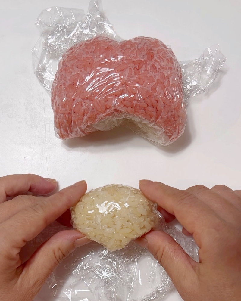 (帽子は表面だけ赤いごはんで作りました)