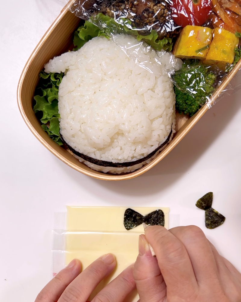 5.海苔を超ネクタイの形にカットしてスライスチーズに貼り付け