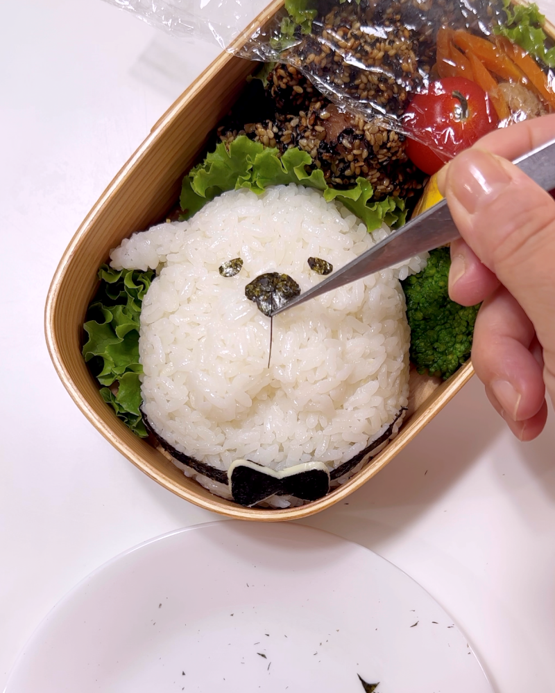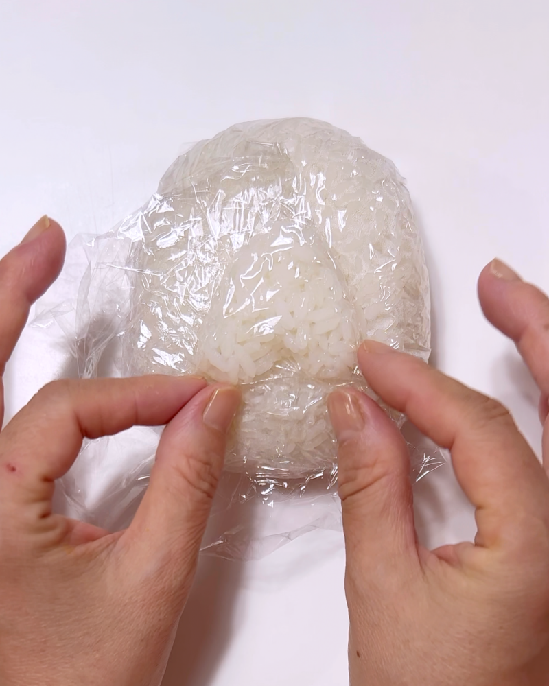 1.ごはんをラップに包み顔、鼻周りを別々ににぎる。