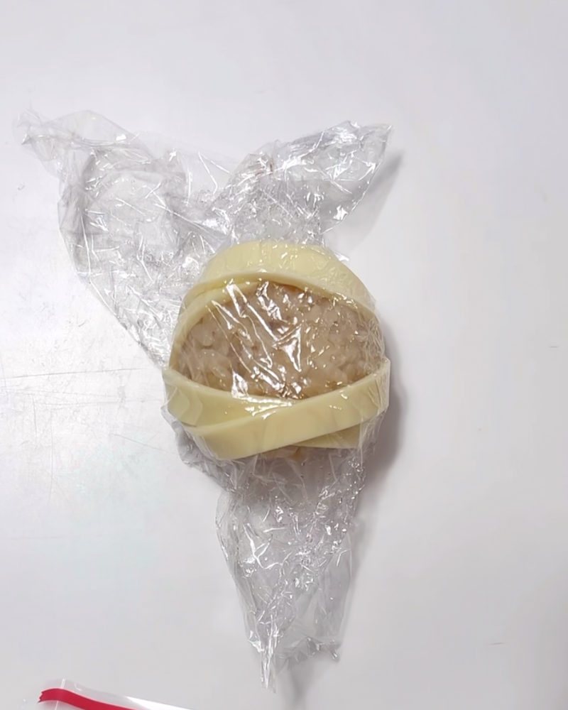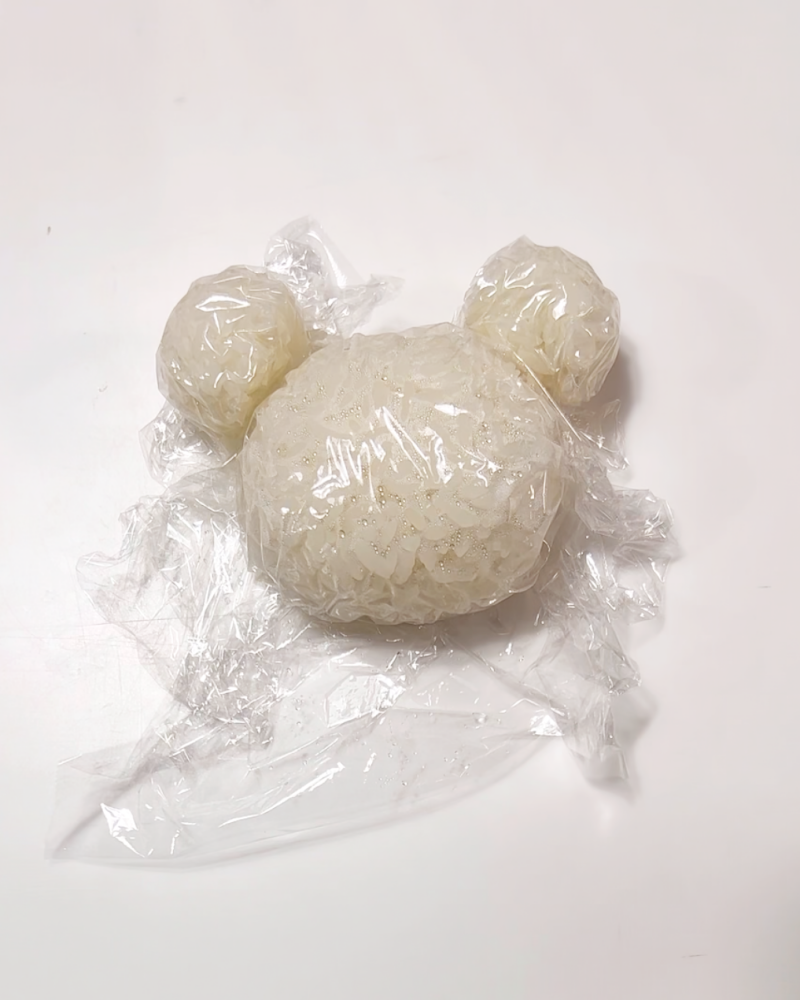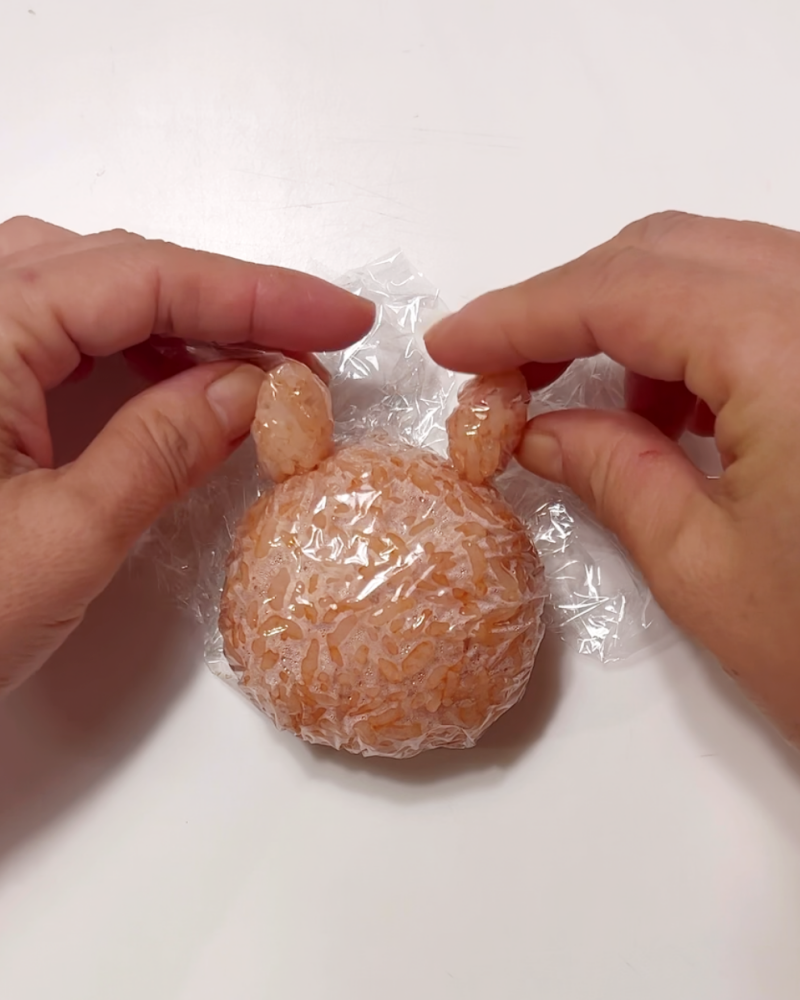 1.KOYAはごはんをラップに包み、顔、耳をそれぞれにぎる。