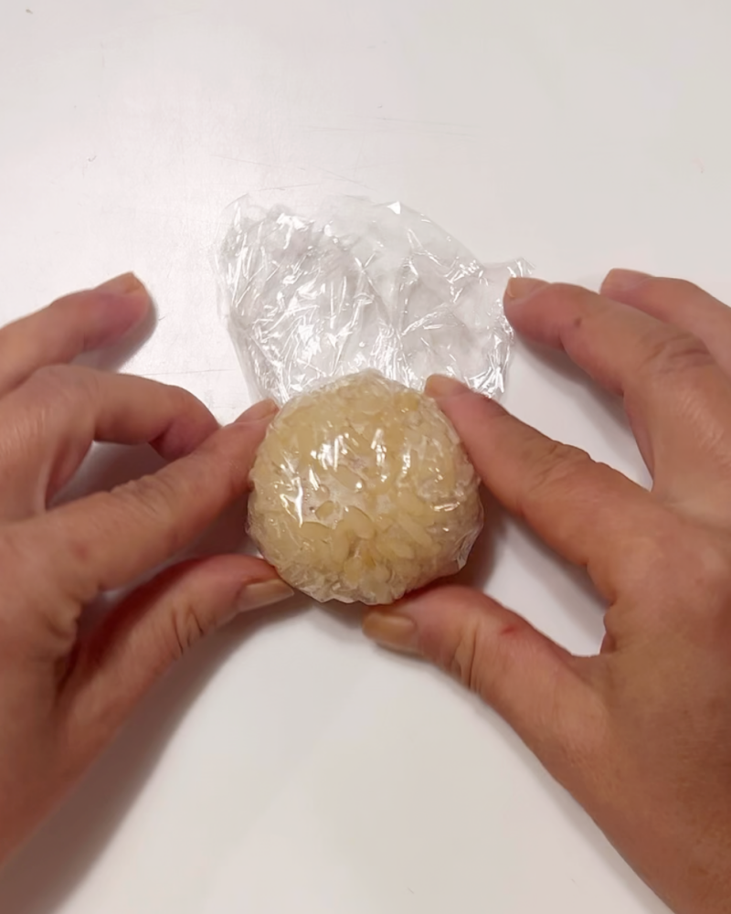 2.SHOOKYはごはんにめんつゆを混ぜてにぎる。