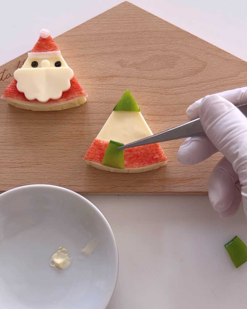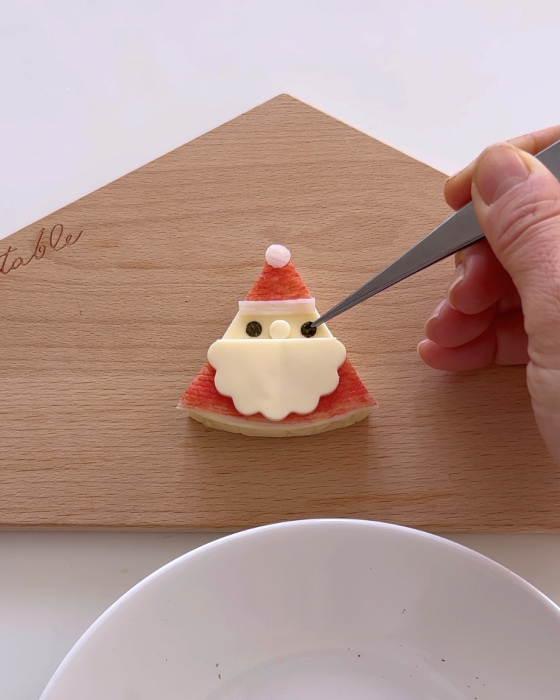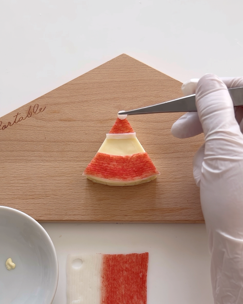 マヨネーズを付けてサンタ同様に上(帽子)に貼り付ける。