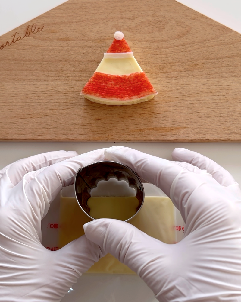 3.白い部分を丸型で抜き、少量のマヨネーズを付けて帽子の先端に貼り付ける。