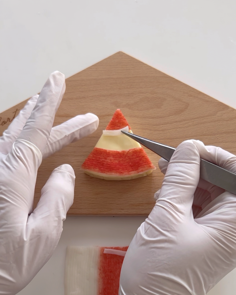 2.帽子の下にカニカマの白い部分を貼り付ける。