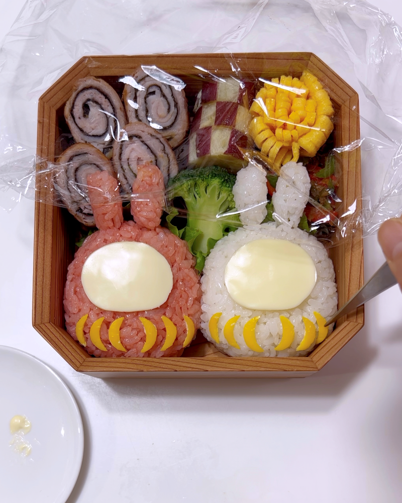 2.お弁当箱に詰め耳を乾燥パスタでとめる。