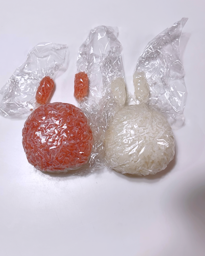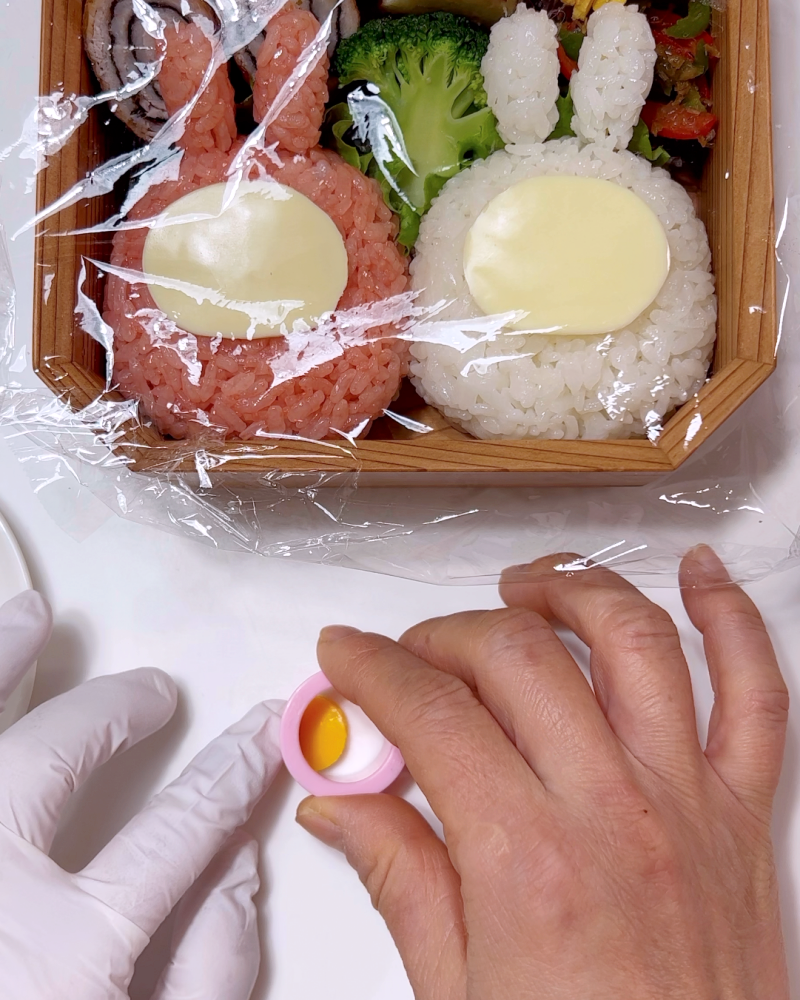 (赤は表面のみ色付きごはんで作りました。ラップの上に