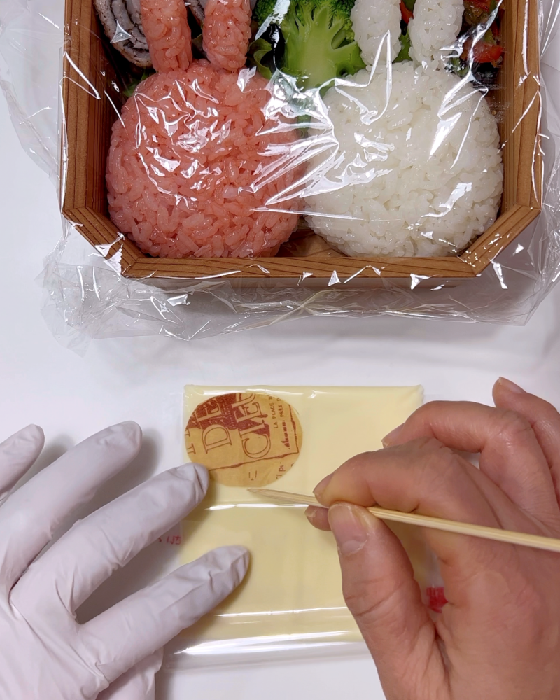 3.顔の部分をクッキングシートで作りスライスチーズの上に貼り付け