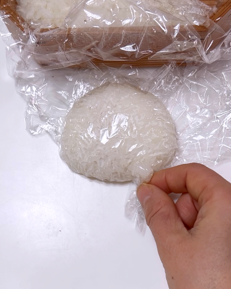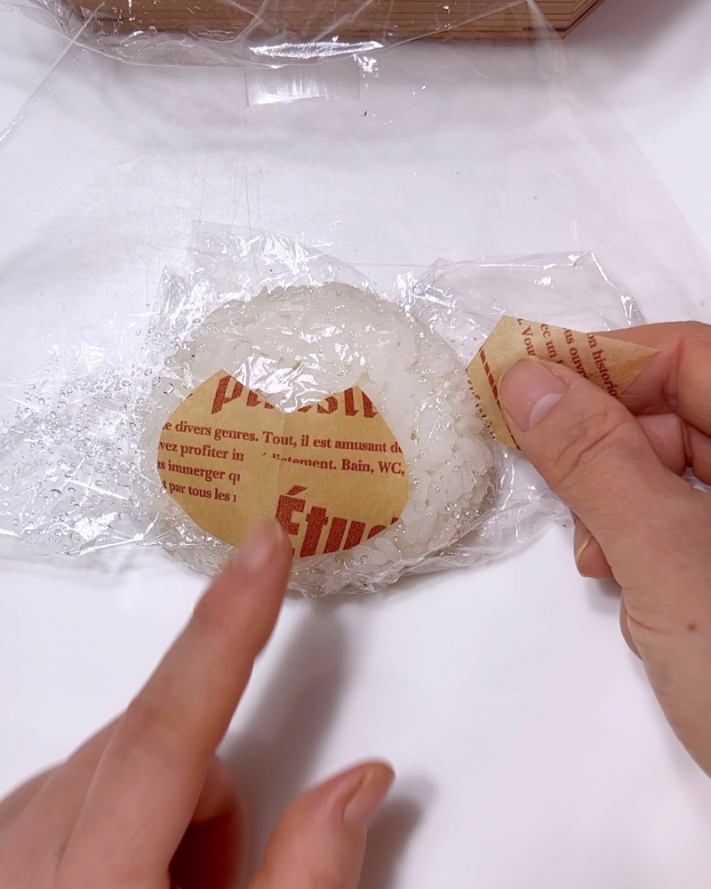 1.ごはんをラップに包み、顔と手をにぎる。