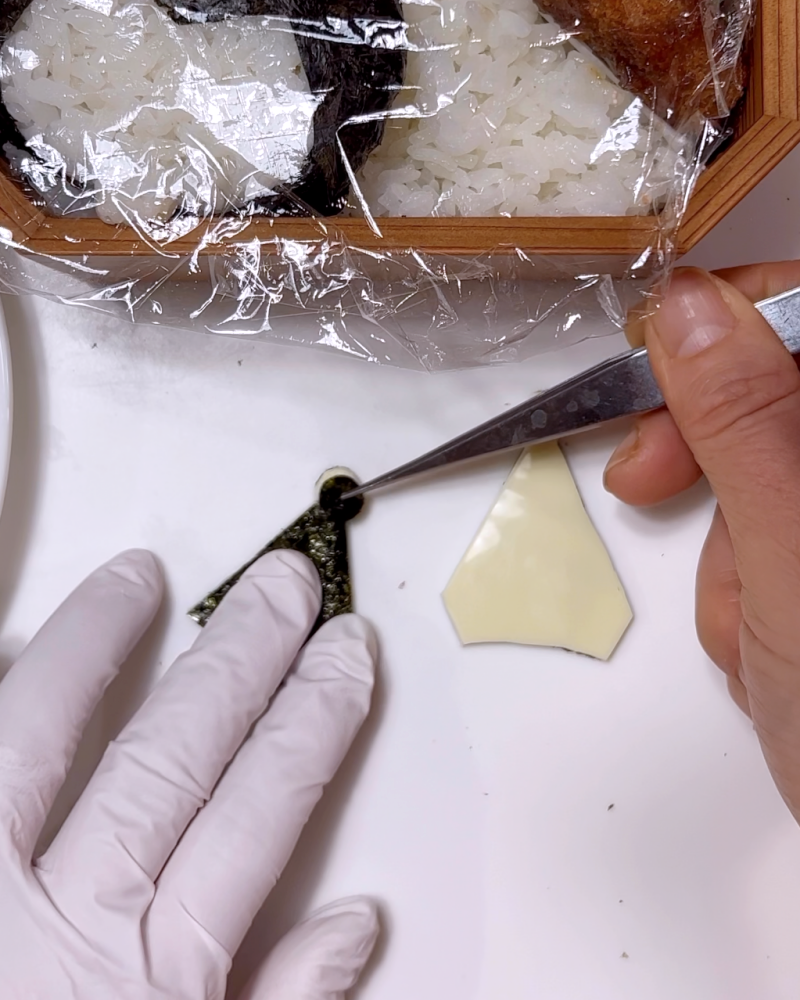 カットした2枚をスライスチーズに貼り付け、先端に丸く抜いた海苔を貼り付ける。