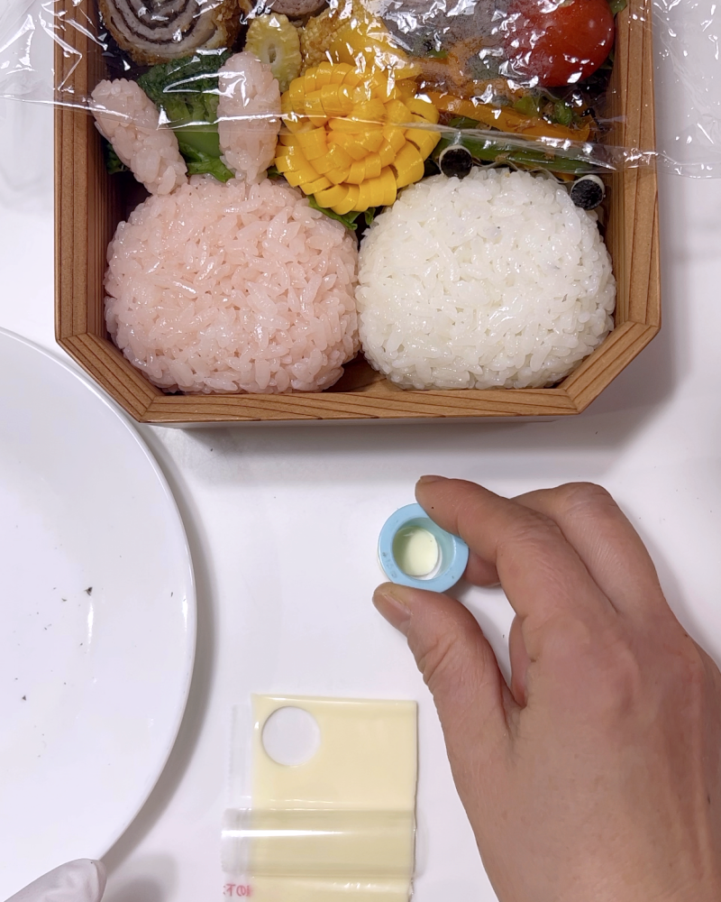 2枚をスライスチーズに貼り付け、周囲を竹串でなぞるようにカットする。