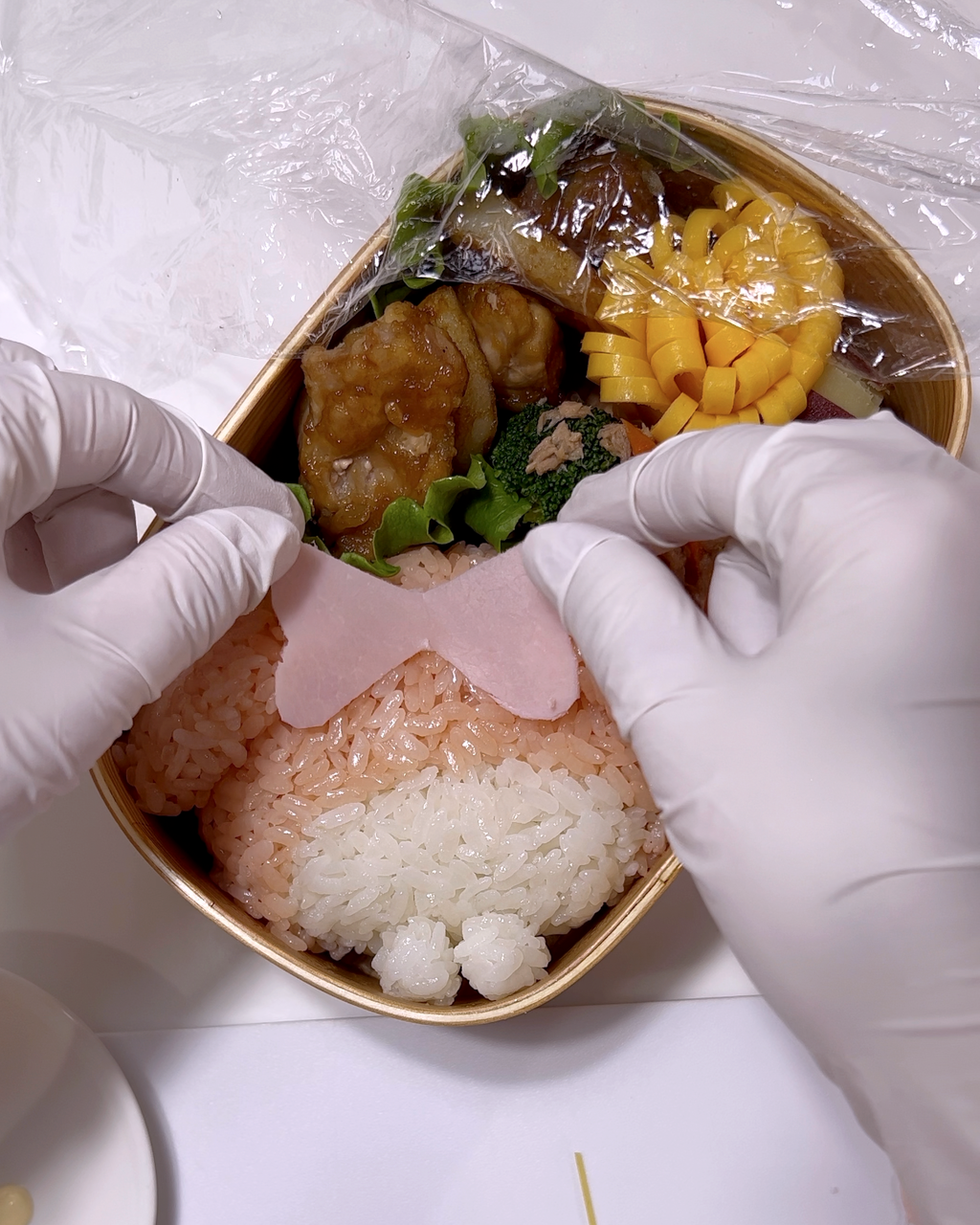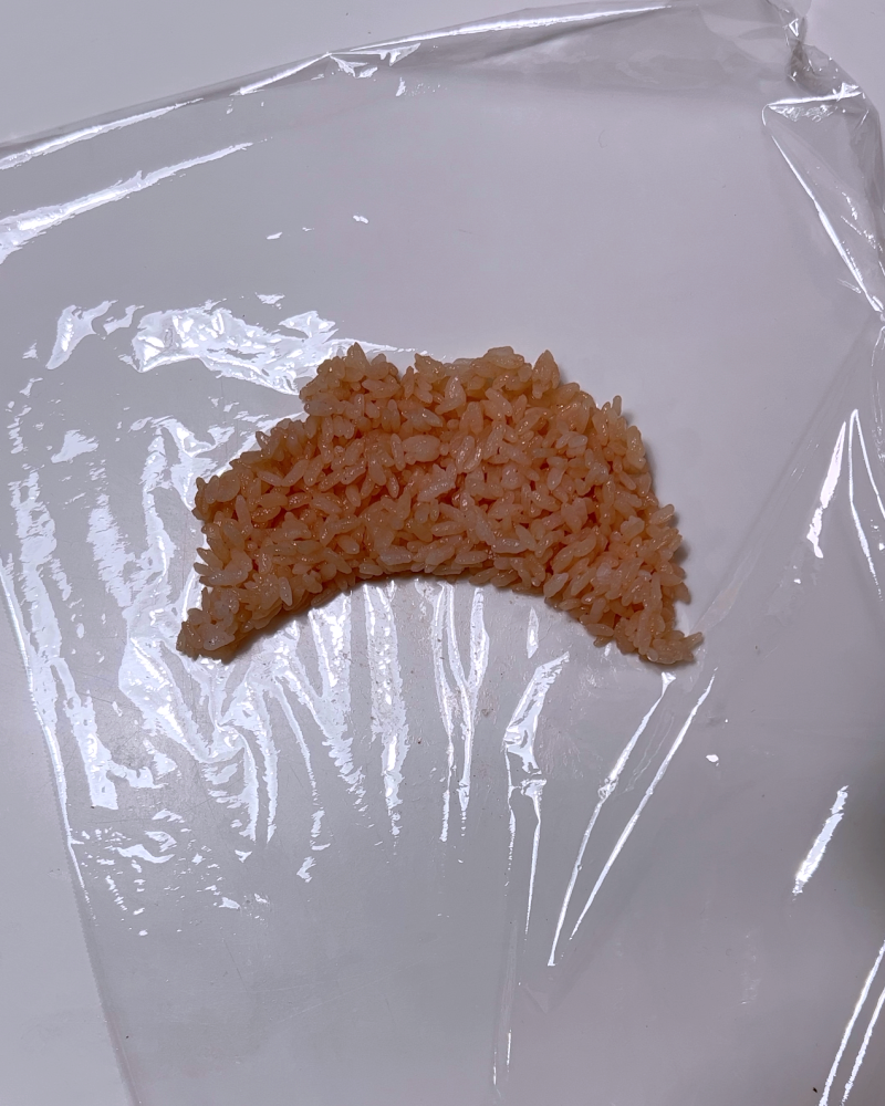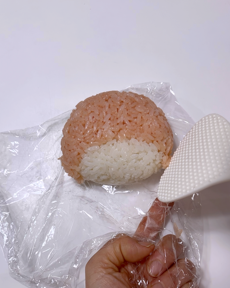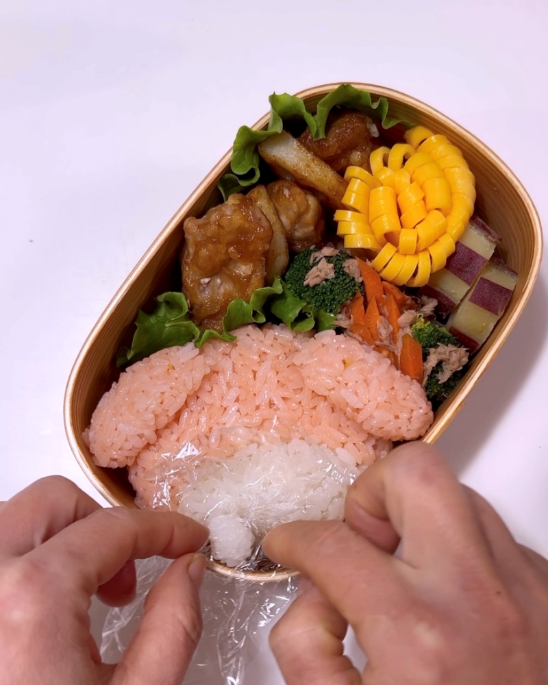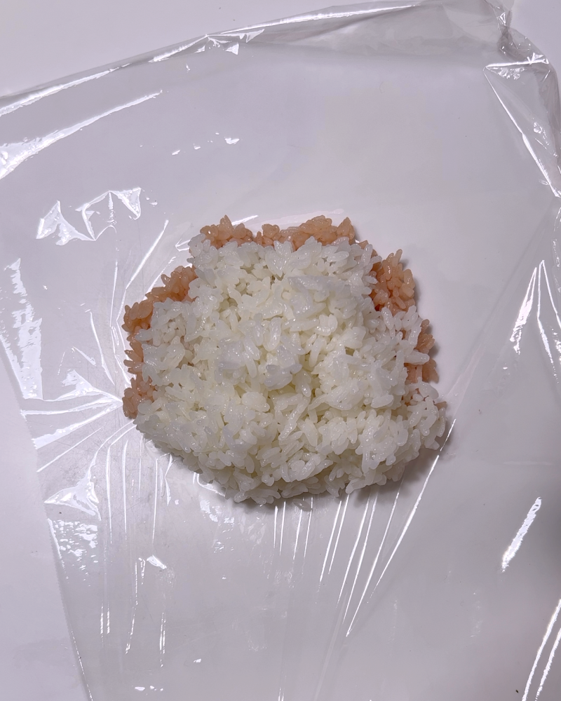 見えない部分からピンクのごはんを取って下の方に少しごはんを足しました。