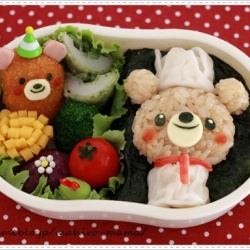 クマちゃんシェフのお弁当♪ 2010-11-3 記事を読む 今日は気持ちのいい秋晴れです♪お出掛けの予定がないのが残念^^;昨日はたくさんのお祝いコメありがとうございました^^ニッスイさんのキャラ弁コンテストに応募したもう1つのお弁当です。味の素さんのコンテストの時に作ったシェフのお弁当 が結構気に入っていたので、