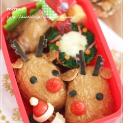 お稲荷さんdeトナカイ&リースサラダのお弁当&作り方♪ 2011-12-9 記事を読む おはようございます^^今日も寒いですね~。週末はお天気が回復するようなので少しは暖かくなるかしら。さて先週作った小太郎の2歳児教室のお弁当です。お弁当2つの日はそれでなくてもバタバタなのに寒くなって早起きが辛い~(>_簡単にお稲荷さんでトナカイを作ってみまし