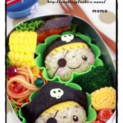 海賊キッズのお弁当&作り方♪ 2011-7-1 記事を読む 今年はパイレーツ・オブ・カリビアンにワンピース、そしてゴーカイジャーと海賊ブームですね。私もそんな流行りに乗って、2年前に作った海賊キッズのお弁当をまた作ってみました^^2011年バージョンの海賊キッズです♪海賊キッズ(めんつゆおにぎり、海苔、薄焼き卵、スラ